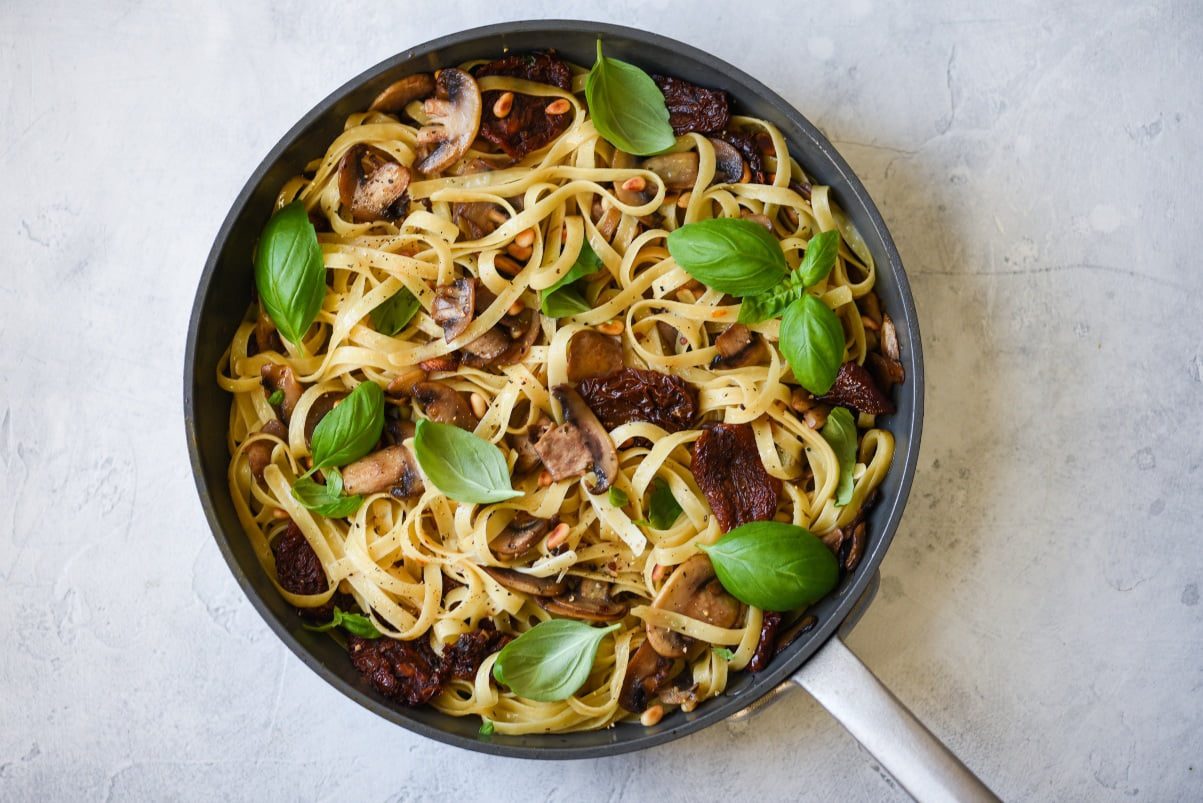 Umami Mushroom Basil and Sun-Dried Tomato Pasta with Toasted Pine Nuts