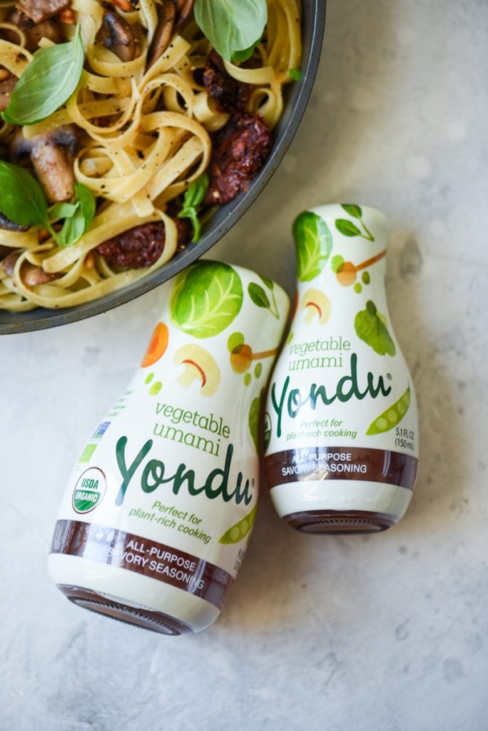 Once the pasta is ready, drain (but reserve about 1-2 tbsp of the pasta water) and add to the pan. Mix well, then add in Yondu (start with 1 tbsp, then taste test and add more if need be) and 1-2 tbsp pasta water and mix again.